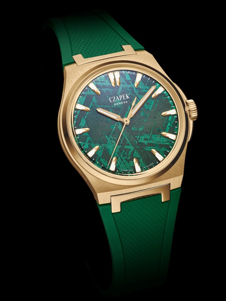 ต่างจากสองรุ่นแรก หน้าปัดนี้ไม่ได้มาจากหินบนโลก แต่จาก อุกกาบาต Gibeon ที่เผยลวดลาย Widmanstätten อันเป็นเอกลักษณ์ เคลือบแลคเกอร์เขียวใส สะท้อนแสงและมิติราวกับมองเข้าไปในจักรวาล เปิดตัวครั้งแรกในเวอร์ชันสตีล และกลับมาอีกครั้งในทองคำเหลือง 2N อบอุ่น ลึกซึ้ง และงดงามกว่าที่เคย