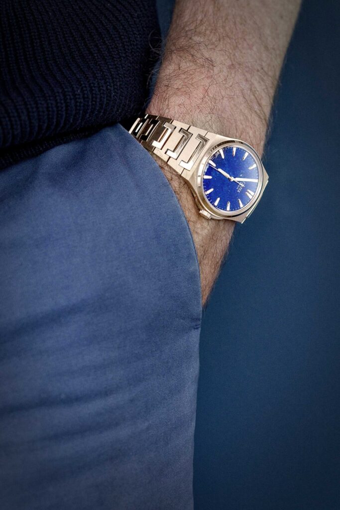 หน้าปัดหิน Lapis Lazuli สีน้ำเงินเข้มดุจฟ้ายามค่ำคืน ประดับประกายทองจากแร่ไพไรต์และเส้นขาวของแคลไซต์อย่างบางเบา ผิวสัมผัสที่เต็มไปด้วยชีวิตและพลัง ถ่ายทอดความงดงามเหนือกาลเวลา