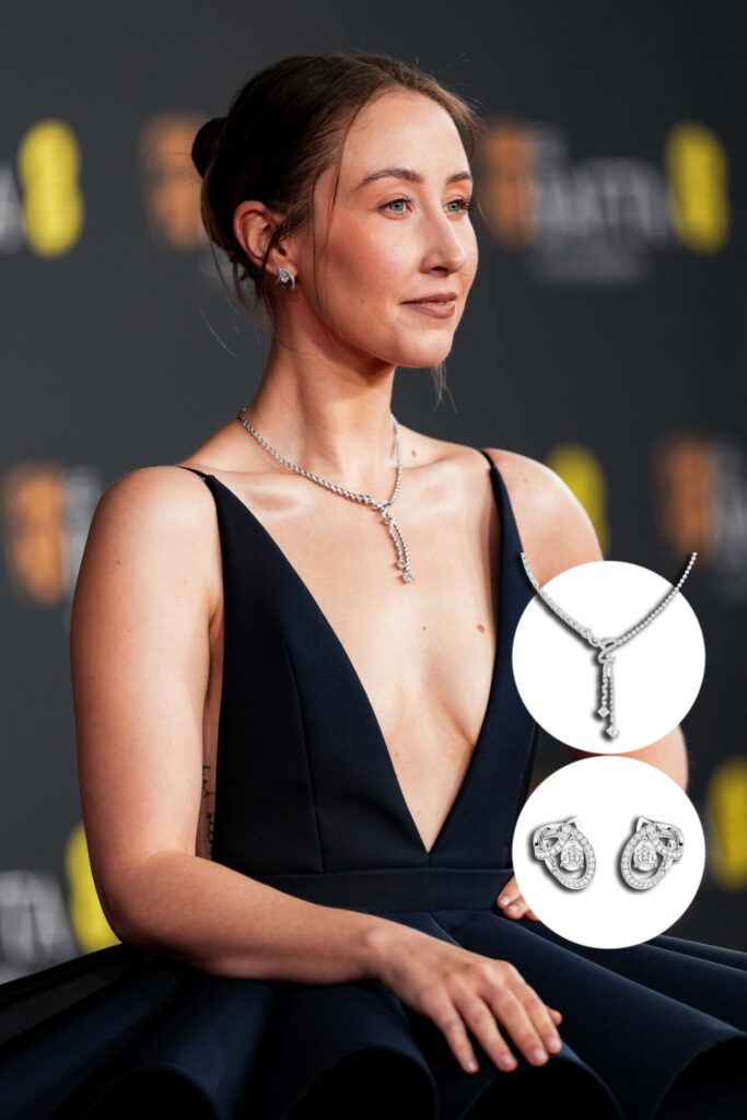 Erin Doherty นักแสดงหญิงชาวอังกฤษ ซึ่งเป็นที่รู้จักจากซีรีส์ชื่อดัง The Crown ได้เข้าร่วมงาน BAFTA Awards และได้รับเลือกให้เป็นผู้มอบรางวัล ในโอกาสนี้ เธอสวมใส่ Chaumet Twisted Necklace ทำจากไวท์โกลด์ประดับเพชร 2 เม็ด และต่างหู Joséphine Aigrette ประดับเพชรทรงหยดน้ำ 2 เม็ด