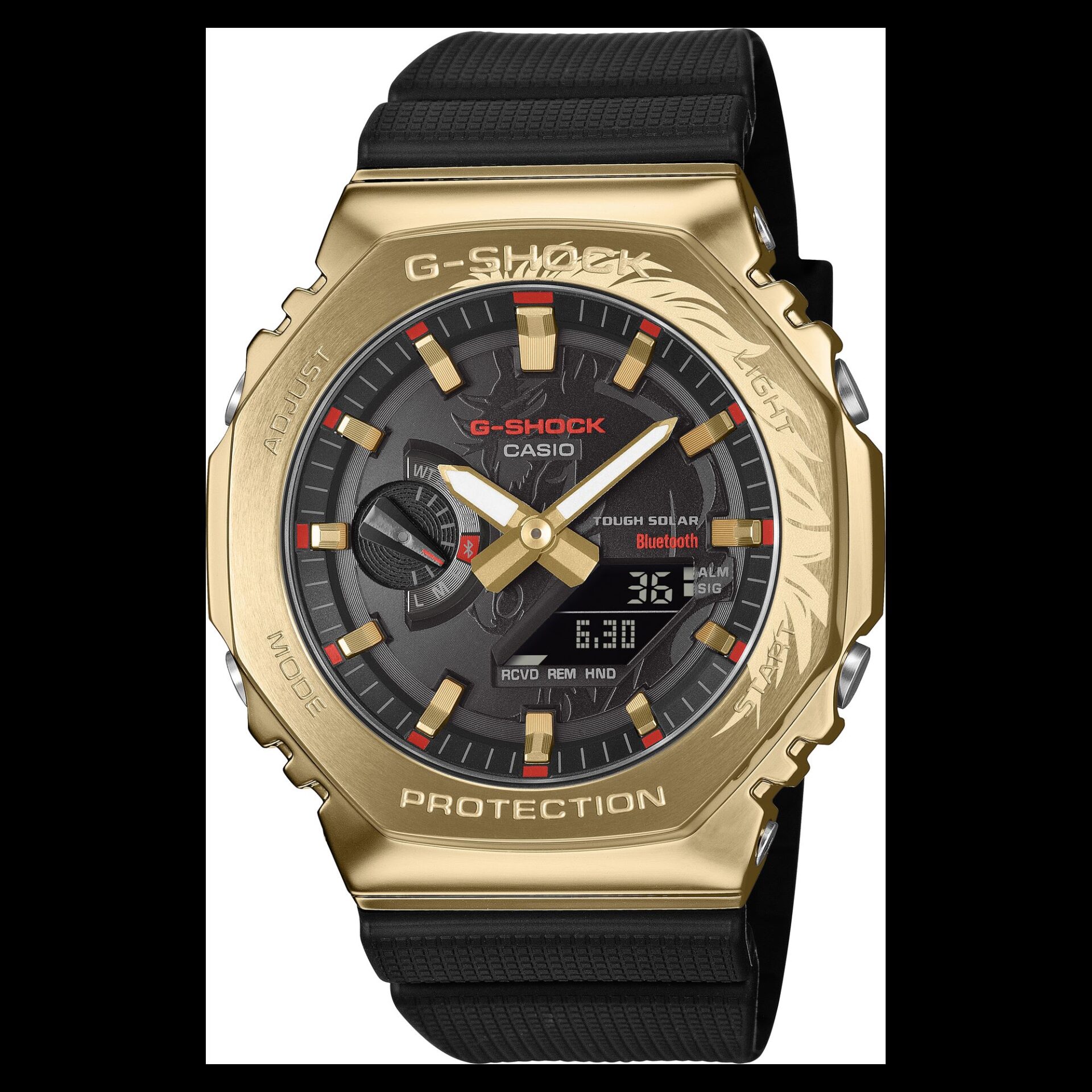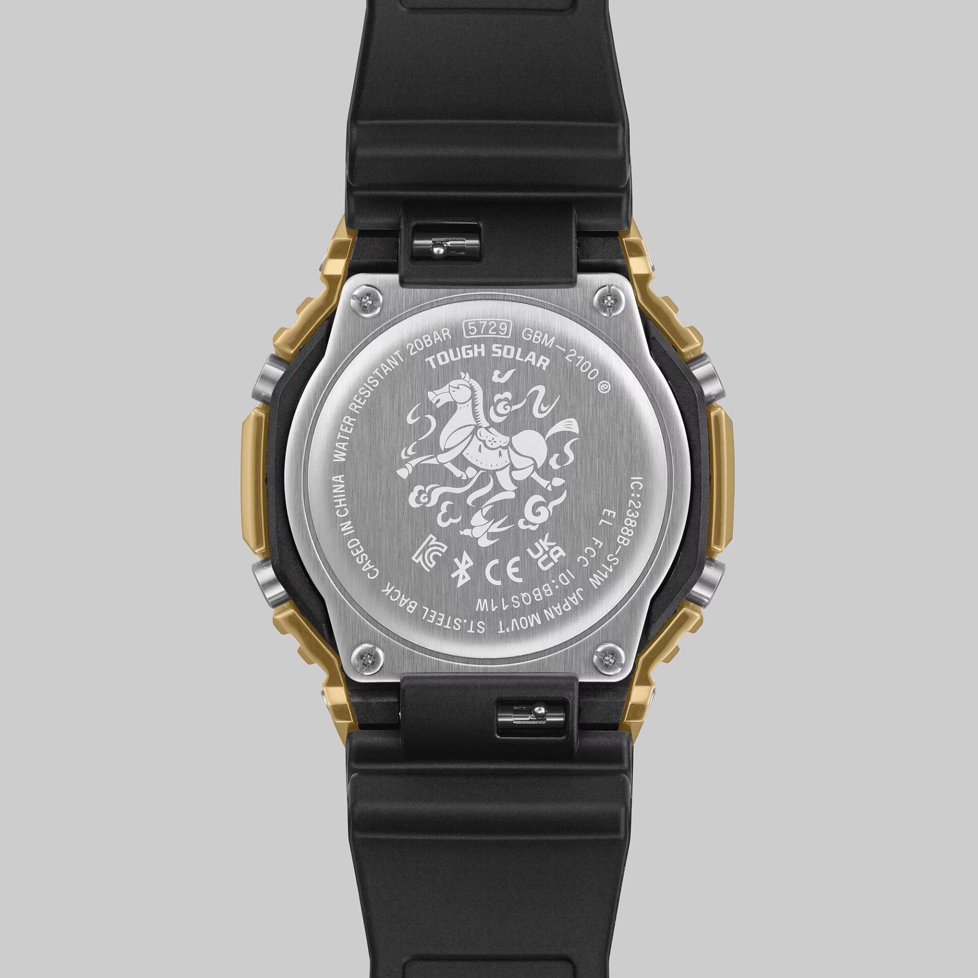 G-SHOCK รุ่นพิเศษ GBM-2100CX-9A โดดเด่นด้วยดีไซน์ลายม้าอันทรงพลังที่ประดับเต็มหน้าปัด พร้อมถ่ายทอดรายละเอียดอย่างประณีตตั้งแต่แผงคอแกะสลักอันสง่างาม ปรากฎออกมายังส่วนกรอบที่ชุบเคลือบไอออนสีทอง ให้ดีไซน์ที่สวยงามอย่างมีมิติ ตัวบอกเวลาสีทองเป็นสัญลักษณ์ของความเป็นสิริมงคลและความรุ่งเรืองของปีใหม่ ตกแต่งตรงปลายด้วยสีแดงที่แสดงถึงความแกร่งของม้าพันลี้