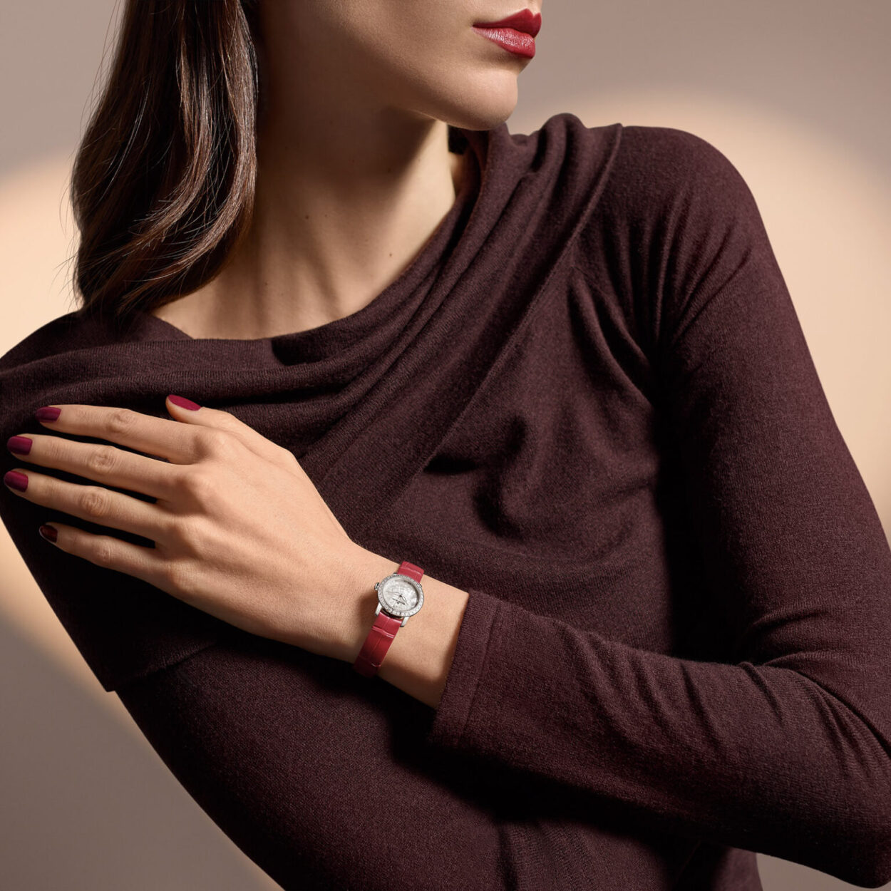 — กลไก Automatic ในร่างจิ๋ว: แม้ตัวเรือนจะเล็กเพียง 21.5 มม. แต่ภายในขับเคลื่อนด้วย Calibre 615 กลไกอัตโนมัติที่ประกอบด้วยชิ้นส่วนถึง 180 ชิ้น สำรองพลังงานได้ 38 ชั่วโมง พร้อมโรเตอร์ทองคำแกะสลักรูปหัวใจ ซึ่งถือเป็นความท้าทายทางวิศวกรรมในการย่อส่วนกลไก