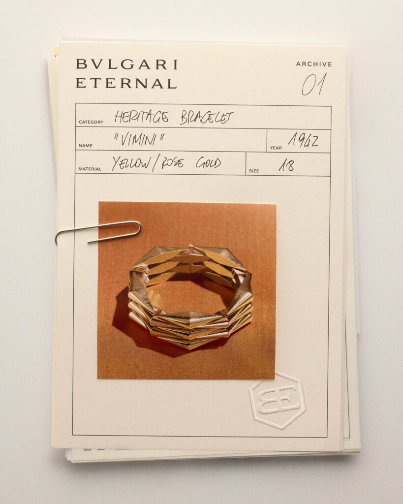 Bvlgari เปิดตัว Bvlgari Eternal คอลเลกชันใหม่ที่ทำหน้าที่เป็น “ประตูสู่คลังมรดกของแบรนด์” ถ่ายทอดแนวคิดการนำงานออกแบบจากอดีตกลับมาตีความใหม่ในบริบทของปัจจุบัน โดยเริ่มต้นบทแรกด้วย Vimini ผลงานที่ได้แรงบันดาลใจจากสร้อยข้อมือในปี 1942 หนึ่งในดีไซน์รากฐานของ DNA แห่ง Bvlgari