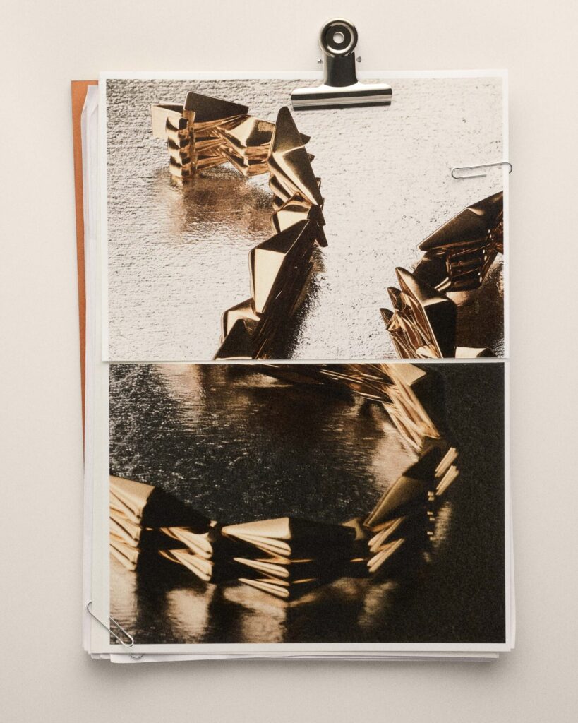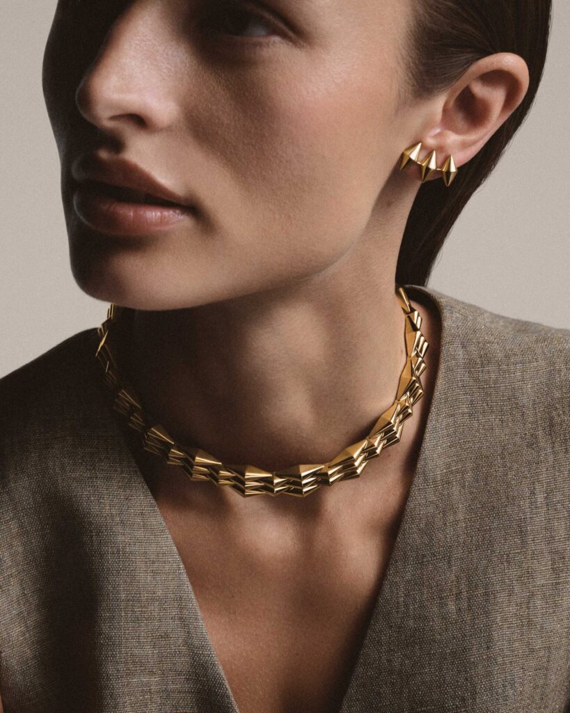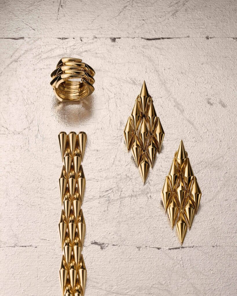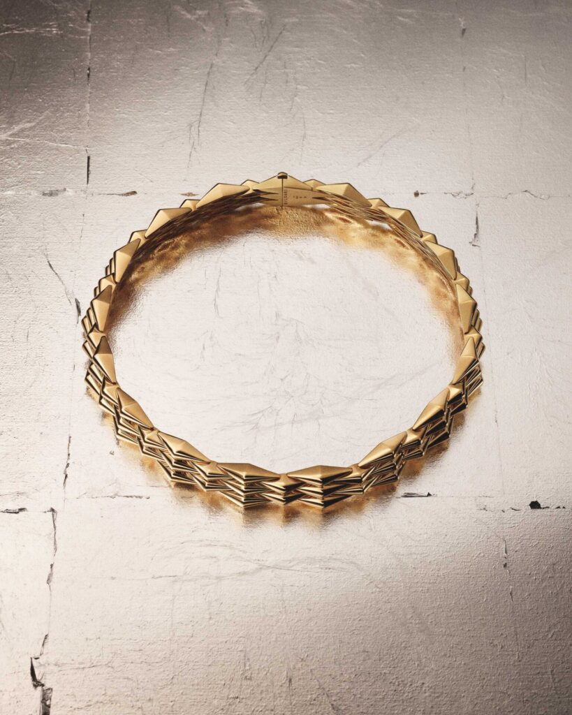 หัวใจของไลน์คือ สร้อยข้อมือ ที่พัฒนาต่อยอดจากต้นแบบในคลังงานออกแบบ โครงสร้างโมดูลทรงสี่เหลี่ยมขนมเปียกปูนเชื่อมต่อกันอย่างยืดหยุ่น โอบรับข้อมือราวกับคลื่นทอง ส่วน สร้อยคอ ถ่ายทอดความลื่นไหลและจังหวะของแสง ขณะที่ แหวน ถูกออกแบบในรูปแบบ 5 แถบที่ยุบขยายได้ เสริมบุคลิกแบบร่วมสมัย