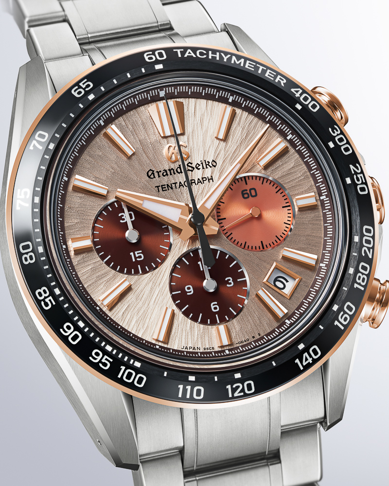 ดีไซน์ของลวดลายบนหน้าปัด ชวนให้นึกถึงทิวทัศน์งดงามของภูเขาอิวาเตะ เมื่อมองจาก Grand Seiko Studio ในเมือง Shizukuishi อันเป็นแหล่งกำเนิดของนาฬิกากลไกทั้งหมดของ Grand Seiko สีทองแดงอมชมพูสุกปลั่ง สะท้อนถึงความยิ่งใหญ่ สง่างาม เสมือนได้โอบรับพลังของแสงแรกยามเช้า