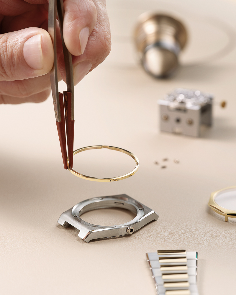 เรือนนี้มาพร้อมตัวเรือนขนาด 39 มม. หนาเพียง 9.8 มม. ผสมผสาน สเตนเลสสตีล กับ เยลโลโกลด์ 3N ได้อย่างกลมกลืน ราวกับพาเราย้อนกลับไปสู่ยุคไบคัลเลอร์ดั้งเดิมของปี 1975 แต่ด้วยเส้นสายที่เฉียบคมและโมเดิร์นกว่าเดิม หน้าปัดสีเทาซันเรย์ลึกแต่งด้วยลาย Clous de Paris และเข็มทอง 3N ที่ส่องประกายภายใต้แสงสลัวราวกับบทเพลงแห่งเวลา