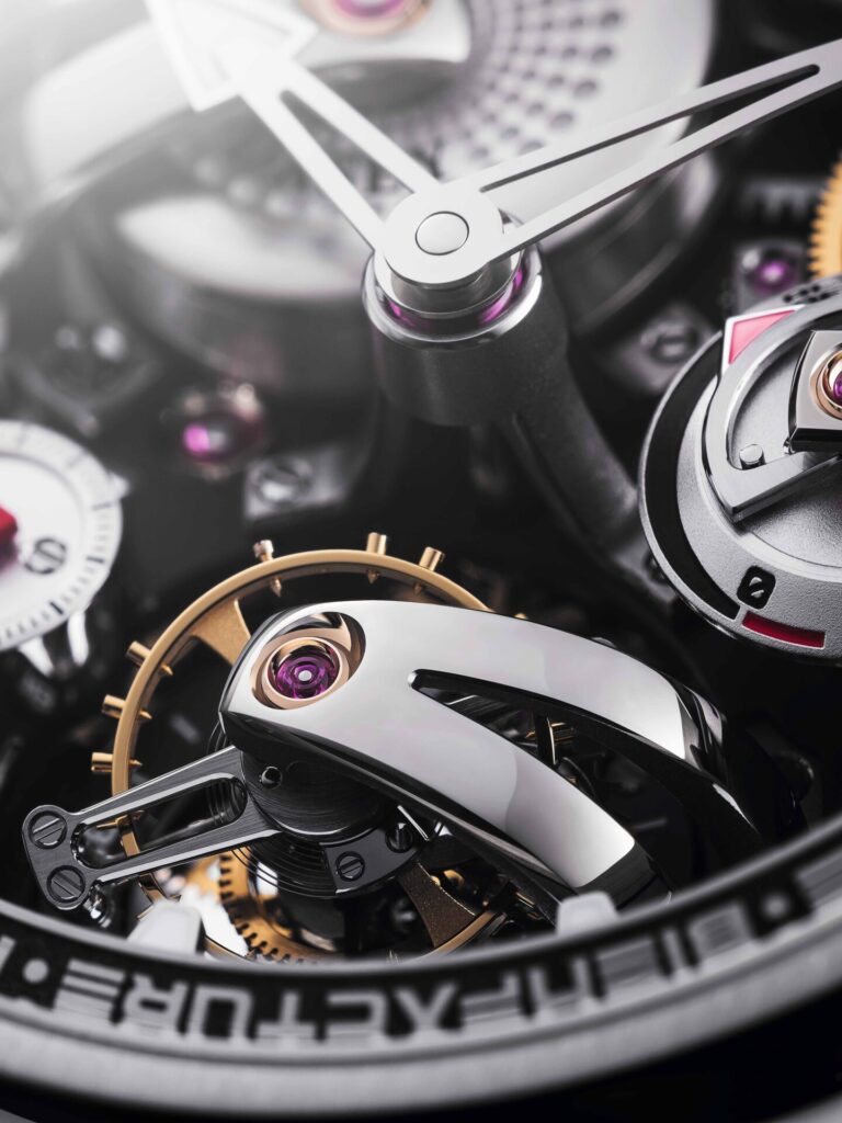 – Fast & Tilted Tourbillon: หัวใจหลักอยู่ที่ชุดทูร์บิญองที่หมุนครบรอบในเวลาเพียง 24 วินาที (เร็วรอบจัดกว่าทูร์บิญองทั่วไปถึง 2.5 เท่า) และวางเอียงทำมุม 25 องศา เพื่อหักล้างแรงโน้มถ่วงอย่างมีประสิทธิภาพในทุกอิริยาบถการสวมใส่