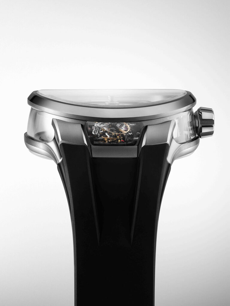 – Movement is the Dial: ตัวเรือนไม่ได้มีหน้าปัดแบบดั้งเดิม แต่ใช้ชิ้นส่วนกลไกทั้ง 354 ชิ้นมาจัดวางให้เป็นสถาปัตยกรรมแบบ 3 มิติที่ดูโปร่งตา ทุกรายละเอียดถูกขัดแต่งด้วยมืออย่างประณีตจนโครงสร้างวิศวกรรมกลายเป็นงานศิลปะที่มองเห็นได้จากทุกมุมมอง