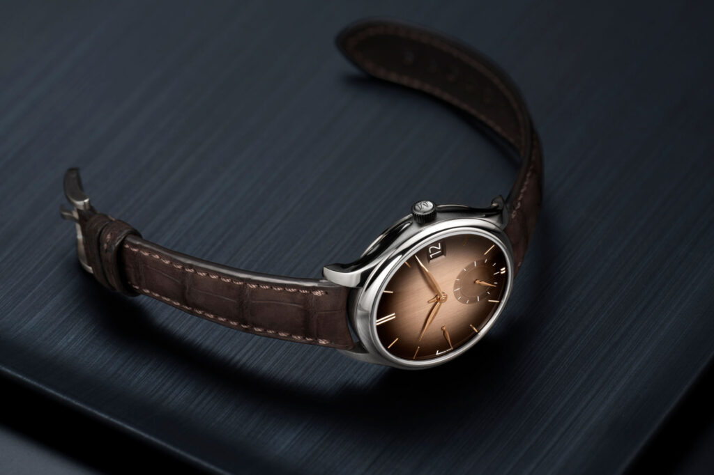 ชื่อที่ฟังดูน่าตั้งคำถาม แต่ยิ่งมองยิ่งหลงใหล — เพราะ “Smoked Salmon” ในที่นี้ไม่ใช่อาหาร แต่คือเฉดสีทองแดงอบอุ่นที่ไล่แสงราววิสกี้บ่มนาน หน้าปัดผ่านการตกแต่งแบบ griffé แนวตั้ง ผสานเอฟเฟกต์ fumé อันเป็นซิกเนเจอร์ของ Moser ที่เปลี่ยนโทนไปตามแสงอย่างมีชีวิตชีวา ตั้งแต่แดงทองระเรื่อไปจนถึงน้ำตาลเข้มละมุน