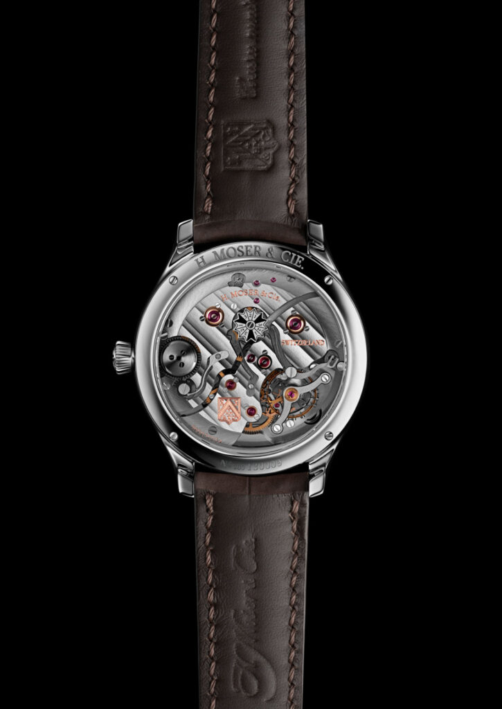 ตัวเรือนทองคำขาว 18K ขนาด 42 มม. จับคู่สายหนังจระเข้น้ำตาลเข้ม ถ่ายทอดความสง่างามแบบ neoclassical minimalism ที่เป็นเอกลักษณ์ของ Moser — เรียบแต่ทรงพลัง ไม่มีโลโก้ชัดเจน มีเพียง ลายเซ็นโปร่งใส บนหน้าปัดที่เหมือนจะซ่อนชื่อไว้ในหมอกแห่งเวลา