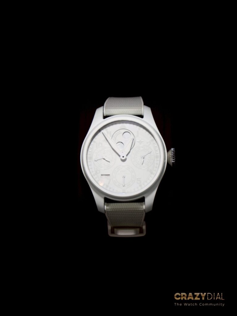 เรือนนี้โดดเด่นด้วยตัวเรือนเซรามิกสีขาวบริสุทธิ์ ตัดกับหน้าปัดสีน้ำเงินเข้มขัดลายซันเบิร์สต์ที่มีการไล่เฉดสีอย่างมีมิติ พลิกไปด้านหลังจะพบกับฝาไทเทเนียมสลักรูปเจ้าชายน้อยอันเป็นซิกเนเจอร์
