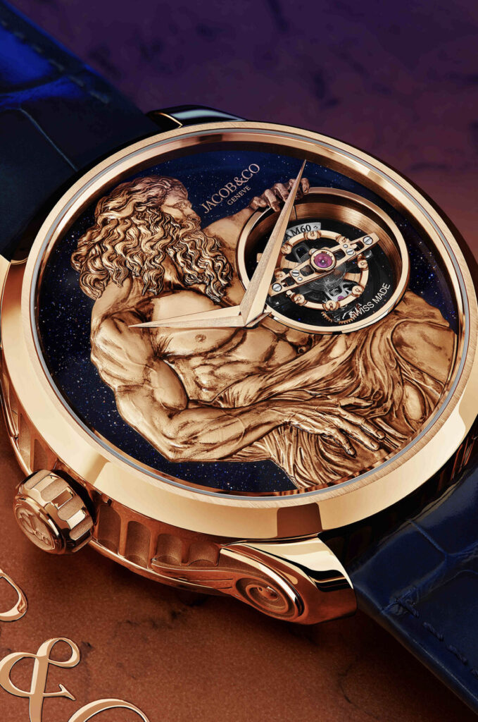 แรงบันดาลใจของเรือนเวลารุ่นนี้มาจาก Chronos เทพเจ้าแห่งกาลเวลาในตำนานกรีก ซึ่งถูกถ่ายทอดออกมาเป็นประติมากรรมสามมิติบนหน้าปัดอเวนเจอรีนสีน้ำเงิน เทพ Chronos ถูกแกะสลักขึ้นจากทองคำโรสโกลด์ 18K ด้วยมืออย่างประณีต ทุกรายละเอียดตั้งแต่เส้นผม กล้ามเนื้อ ไปจนถึงพื้นผิวที่สะท้อนร่องรอยแห่งกาลเวลา สะท้อนถึงความยิ่งใหญ่และพลังของเวลาได้อย่างน่าเกรงขาม