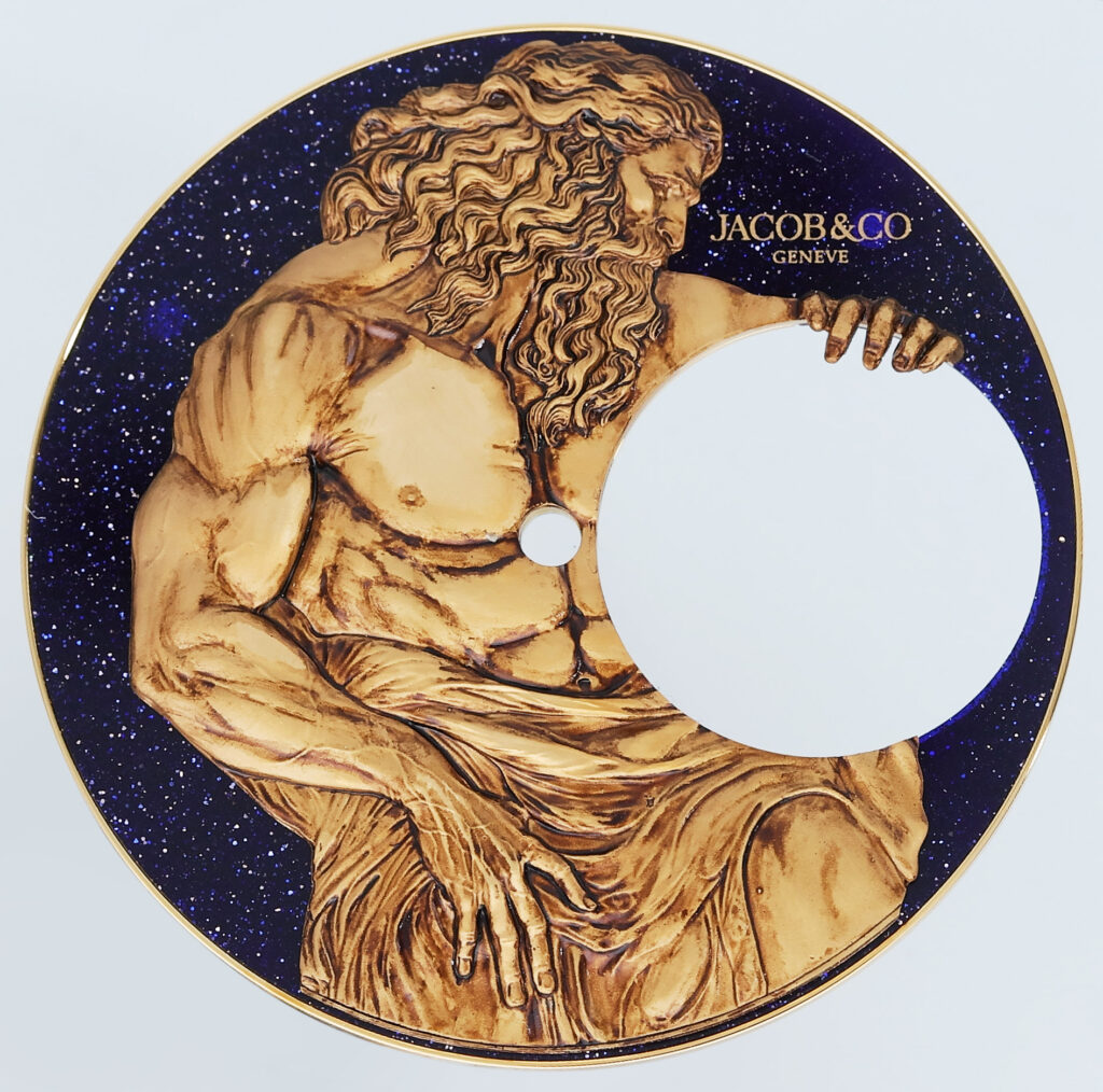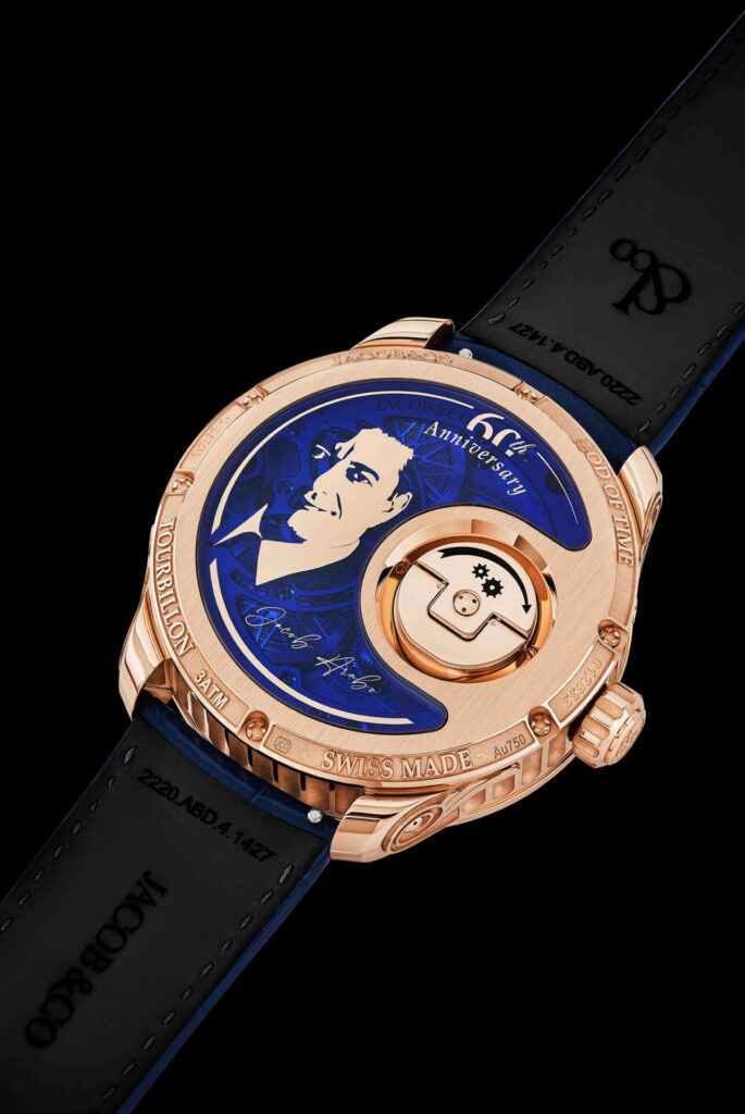 ตัวเรือนขนาด 44.5 มม. ผลิตจากทองคำโรสโกลด์ 18K ได้รับแรงบันดาลใจจากสถาปัตยกรรมวิหารกรีกโบราณ เส้นสายรอบตัวเรือนและเม็ดมะยมตกแต่งลวดลายคล้ายเสาหินแบบไอโอนิก ฝาหลังคริสตัลแซฟไฟร์สีน้ำเงินสลักลายใบหน้าและลายเซ็นของ Jacob Arabo ผู้ก่อตั้งแบรนด์ เพื่อเฉลิมฉลองวาระครบรอบ 60 ปีของเขา