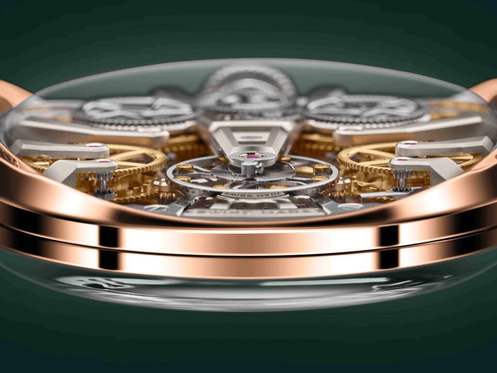 Case 39mm: ตัวเรือนทำจาก 5N Rose Gold ขนาด 39 มม. ขัดเงาที่ขอบหน้าปัดและด้านข้าง ตัดกับสีเขียวได้อย่างอบอุ่นและหรูหรา