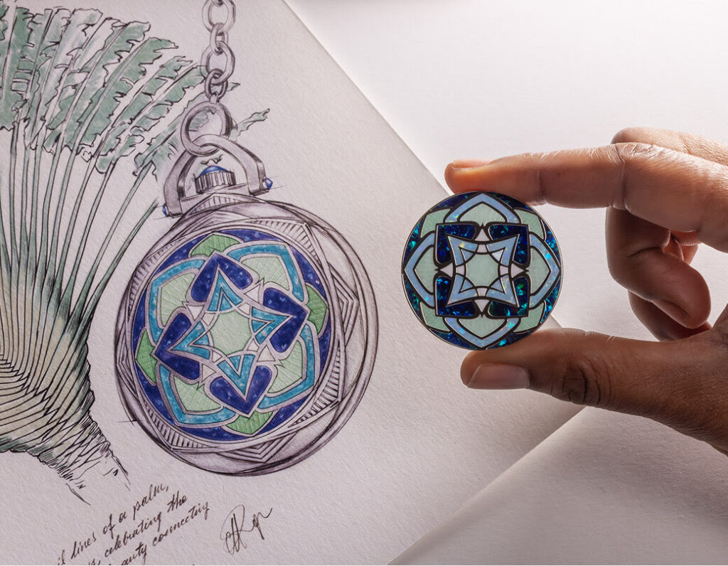 งานแกะสลัก: ลวดลายสมมาตรของใบปาล์มถูกแกะสลักลงบนตัวเรือน หน้าปัด และแม้แต่สะพานจักรของกลไก!