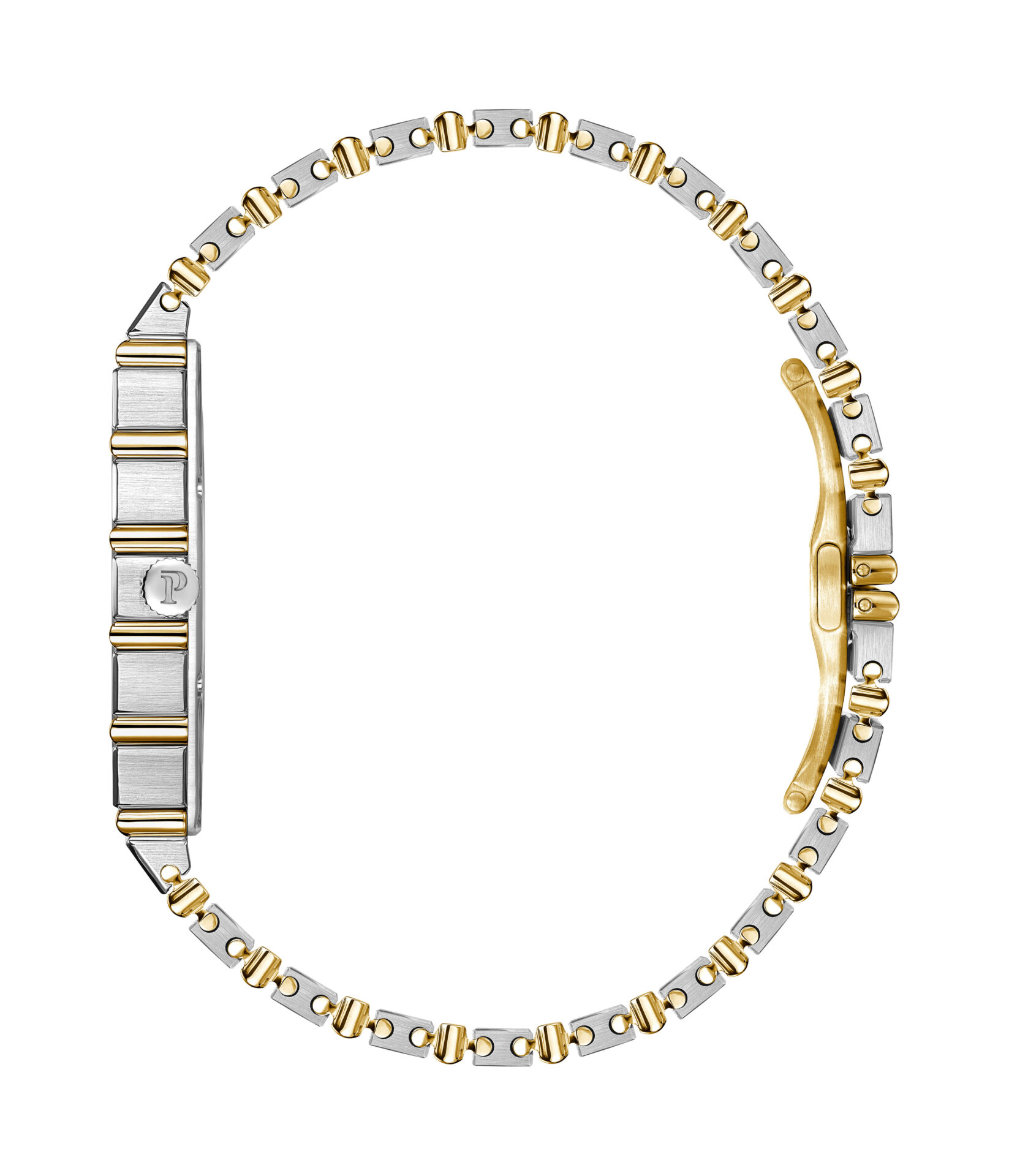 ตัวเรือนและสายนาฬิการังสรรค์จากไวท์โกลด์ขัดซาติน ตัดสลับด้วยโครงสร้างข้อต่อเยลโลว์โกลด์ขัดเงา