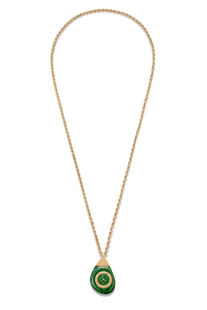 แต่ละเรือนรังสรรค์ตัวเรือนจากหินแต่ละชนิดในแบบชิ้นเดียว นำไปเจาะอย่างประณีตให้เกิดช่องว่างสำหรับบรรจุกลไก ก่อนจะปิดผนึกเป็นรูปทรงก้อนกรวดอย่างเนียนเรียบไร้รอยต่อ ตัวเรือนหินที่เกลี้ยงเกลานี้แขวนอยู่บนสายสร้อยทองคำบิดเกลียวที่เผยถึงความเชี่ยวชาญด้านงานช่างทองและเทคนิคการเรียงร้อยสายโซ่ของ Piaget ได้อย่างไร้ที่ติ