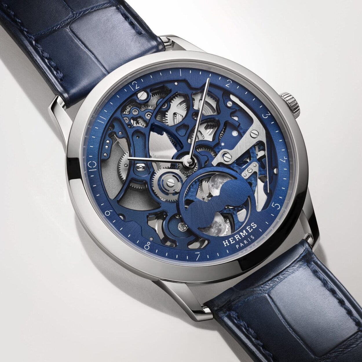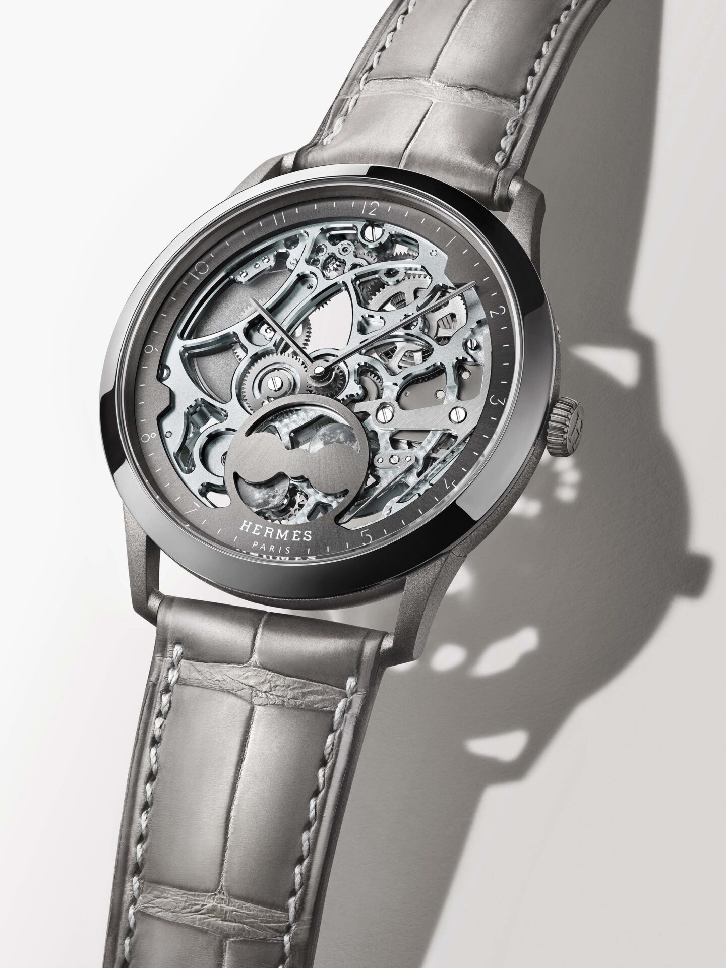 Hermès (Hermès ) ถ่ายทอดนิยามแห่งความสง่างามร่วมสมัยผ่าน Slim d’Hermès Squelette Lune เรือนเวลาที่ถือกำเนิดขึ้นในปี ค.ศ. 2015 ถ่ายทอดอัตลักษณ์ร่วมสมัย ภายใต้ตัวเรือนไทเทเนียมหรือแพลทินัม ขนาด 39.5 มม. พร้อมขอบตัวเรือนวัสดุเดียวกันกับแต่ละเวอร์ชัน โครงสร้างแบบสเกเลตันเผยกลไกจักรกลผ่านหน้าปัดโอเพนเวิร์กอันบางเบา ผสานความแข็งแรงและความโปร่งใสราวบทกวีแห่งเวลา เติมเต็มมิติอันเหมือนฝันด้วยการแสดงดวงจันทร์คู่ ซึ่งเป็นเอกลักษณ์ของ Hermès ขับเคลื่อนด้วยกลไกอัตโนมัติบางพิเศษ Manufacture Hermès H1953 แสดงชั่วโมง นาที และข้างขึ้น-ข้างแรม พร้อมสะพานจักรที่สามารถมองเห็นได้ผ่านฝาหลังกระจกแซฟไฟร์ ตกแต่งโทนสีสอดคล้องกับหน้าปัด และปิดท้ายด้วยสายหนังจระเข้แบบด้านหรือสายหนังวัว ถ่ายทอดความเชี่ยวชาญด้านเครื่องหนังของเฮาส์ได้อย่างสมบูรณ์แบบฃ