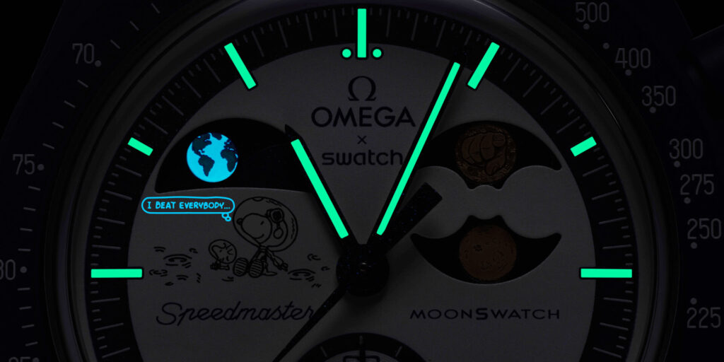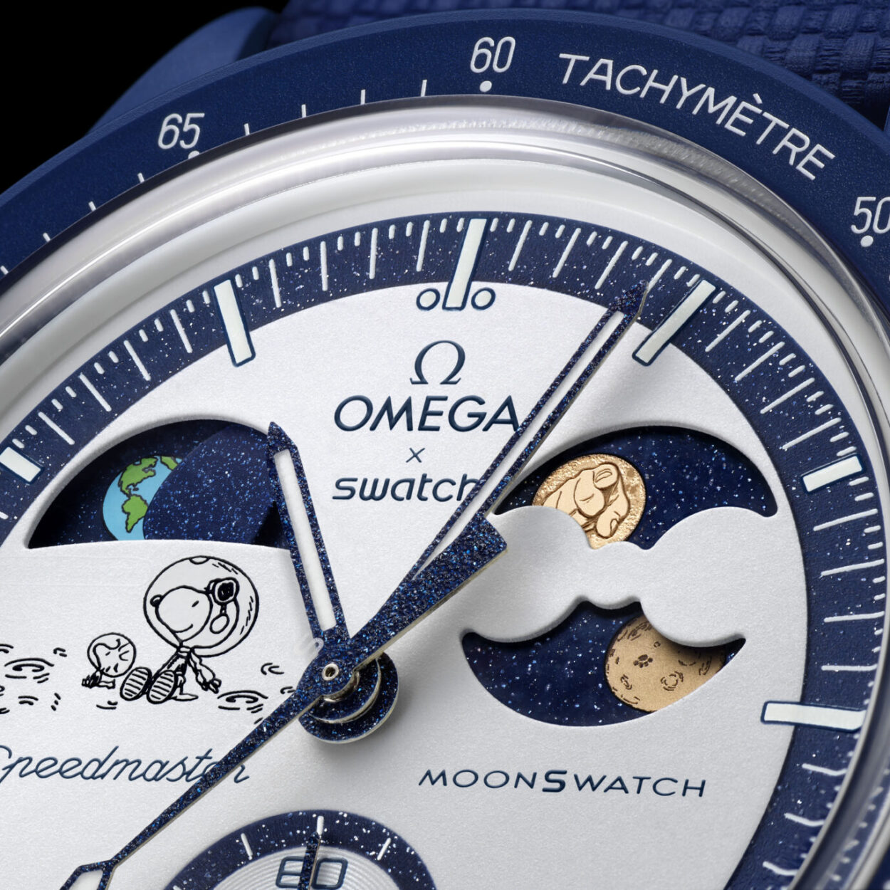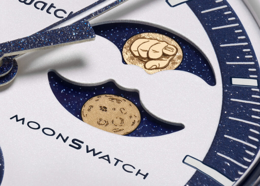 รุ่นนี้ยังคง DNA ของ MoonSwatch ไว้อย่างครบถ้วน—ตัวเรือน Bioceramic สีกรมเข้มที่เป็นเอกลักษณ์ น้ำหนักเบาแต่ทนทาน ผสานกลิ่นอายของ Speedmaster Moonwatch จาก OMEGA ทั้งรูปทรงตัวเรือนแบบอสมมาตร และมาตรวัดความเร็วที่มีจุดเหนือเลขเก้า (“Dot over Ninety”) อันโด่งดัง แต่ครั้งนี้ Swatch เพิ่ม “เวทมนตร์แห่งจักรวาล” เข้ามาอีกขั้น กับฟังก์ชัน บอกดิถีของโลกและดวงจันทร์ ที่ซ่อนรายละเอียดสุด geek เอาไว้เต็มเปี่ยม บนหน้าปัดโอปาลีนสีขาว จะเห็น ดวงจันทร์คู่เคลือบ Moonshine™ Gold จาก OMEGA ที่หมุนวนในจังหวะข้างขึ้นข้างแรม
