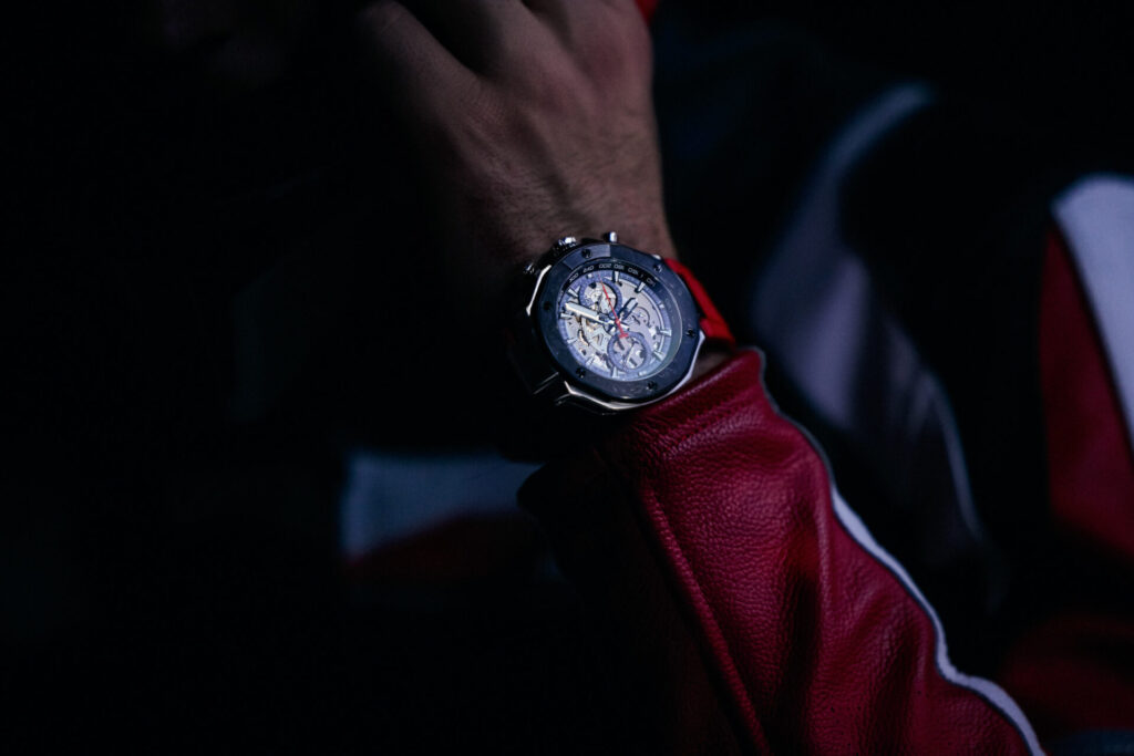 อีกหนึ่งรุ่นลิมิเต็ดขนาด 45 มม. ถ่ายทอดลุคสปอร์ตด้วยโทนดำตัดแดง โดดเด่นด้วยดีไซน์ขอบหน้าปัดทรงจานเบรก ปุ่มกดสีแดง และเส้นสายตัวเรือนที่สะท้อนแรงบันดาลใจจากเครื่องยนต์