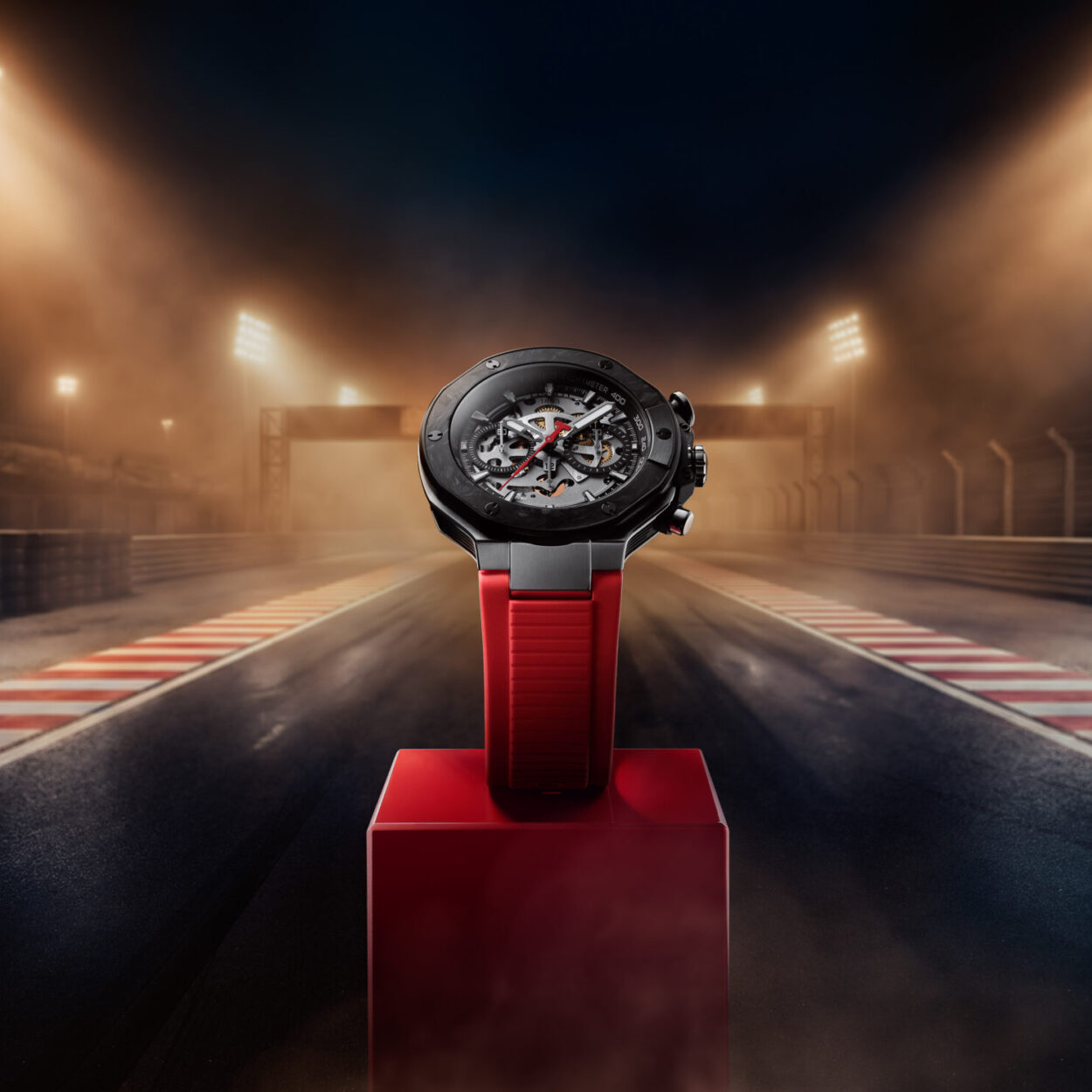 ดีไซน์ได้แรงบันดาลใจจากชิ้นส่วนมอเตอร์สปอร์ตเต็มพิกัด — ขอบหน้าปัดทรงจานเบรก ชิ้นส่วนคาร์บอนฟอร์จ ขอบเคส PVD สีดำ เข็มวินาทีสีแดงจับคู่มาตรวัด Tachymeter เข็มและหลักชั่วโมงเคลือบ Super-LumiNova® กันน้ำ 100 เมตร
