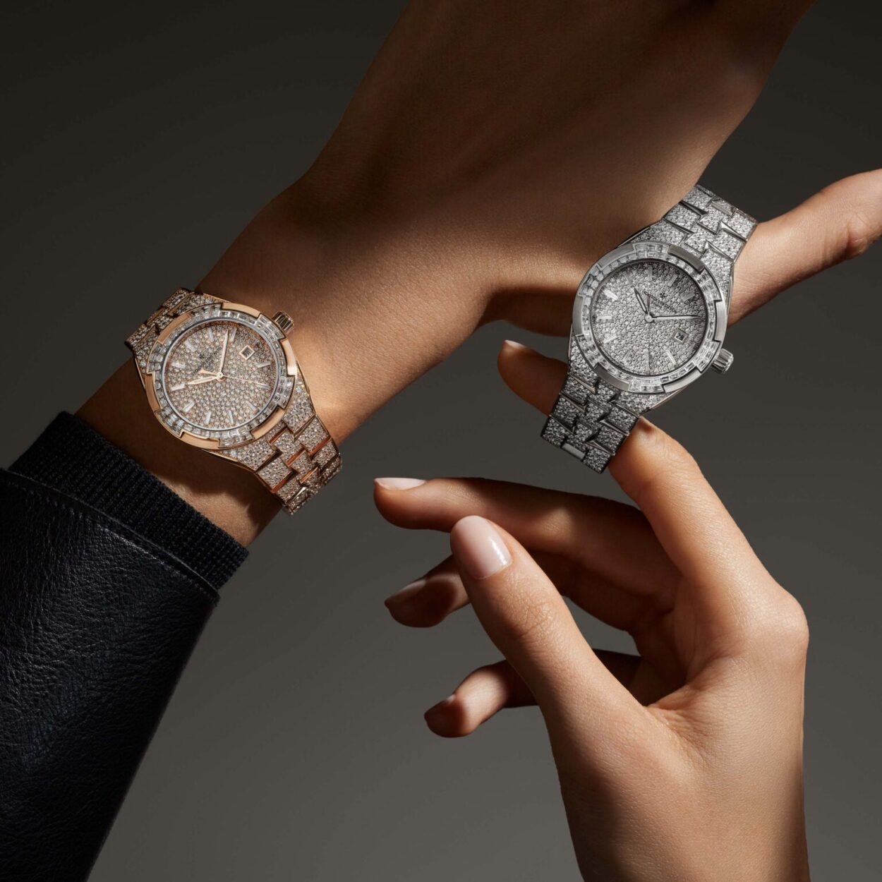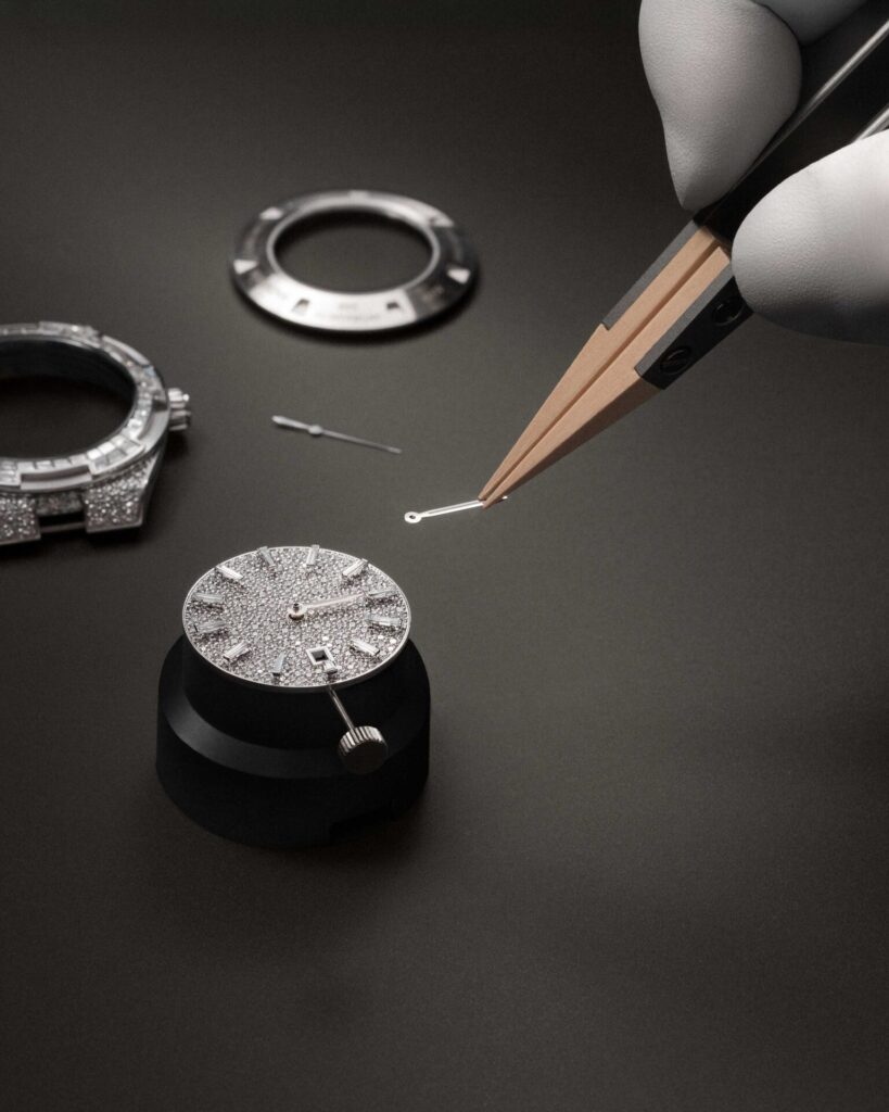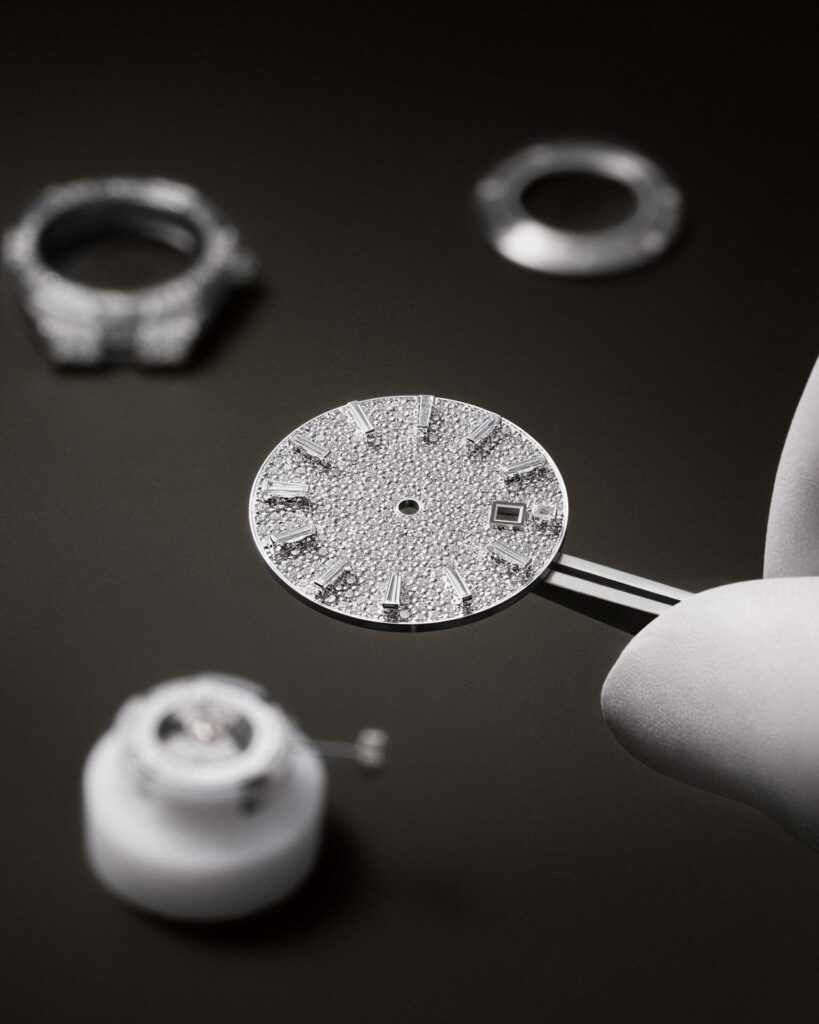 Snowfall of Diamonds: ส่วนหน้าปัดและสายนาฬิกาถูกปูเต็มไปด้วยเพชรทรง Brilliant-cut ที่เล่นแสงระยิบระยับ ตัดกับความเรียบเนียนของเพชร Baguette บนขอบตัวเรือนได้อย่างมีมิติ