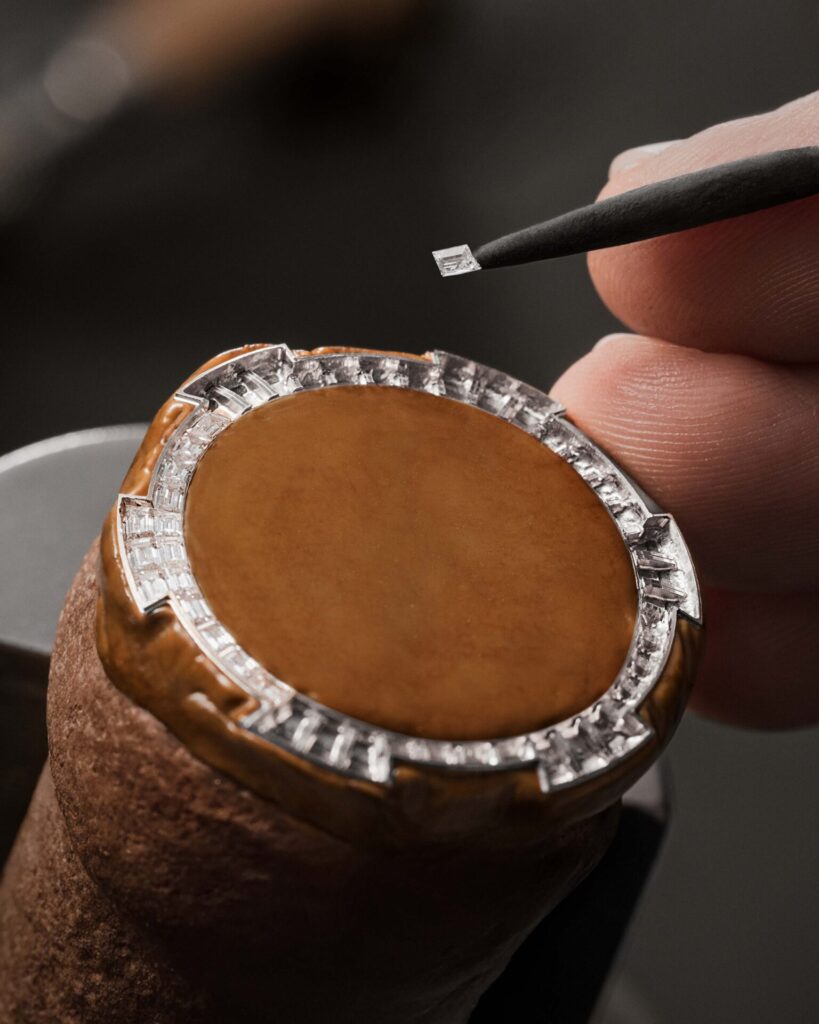 Invisible Setting: ช่างฝีมือใช้เทคนิคการฝังแบบ “ไร้หนามเตย” กับเพชรทรง Baguette-cut จำนวน 60 เม็ด ทำให้เพชรดูเหมือนลอยอยู่บนตัวเรือนอย่างไร้รอยต่อ