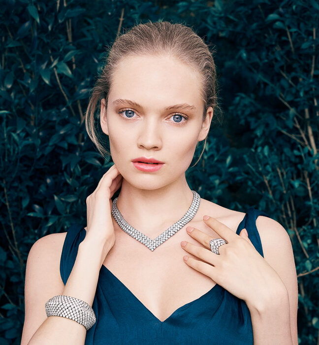 ย้อนกลับไปในปี 1981 คอลเลกชัน À Cheval หรือ “เหลี่ยมหลังม้า” ได้ถือกำเนิดขึ้นเพื่อตอกย้ำความบริสุทธิ์และประกายสุกสว่างของเพชร ผ่านเทคนิคการฝังอัญมณีอันวิจิตรที่จัดเรียงซ้อนเป็นชั้นเสมือนขั้นบันได ให้เพชรแต่ละเม็ดเปล่งประกายดุจประติมากรรมนูนต่ำ สะท้อนแสงละมุนจากทุกมุมมอง ขณะเดียวกันโครงสร้างที่ซับซ้อนยังมอบความยืดหยุ่นแนบเนียนไปกับเรือนร่างอย่างเป็นธรรมชาติ บางผลงานยังสอดแทรกความคิดสร้างสรรค์ที่สามารถพลิกแพลงการสวมใส่ได้หลากหลาย ไม่ว่าจะเป็นสร้อยคอที่แยกออกเป็นสร้อยข้อมือสองเส้น หรือจี้และต่างหูที่สามารถปรับเปลี่ยนเป็นเข็มกลัดได้อย่างงดงาม ถ่ายทอดจิตวิญญาณแห่งนวัตกรรมและงานหัตถศิลป์อันเป็นเอกลักษณ์ของเมซง
