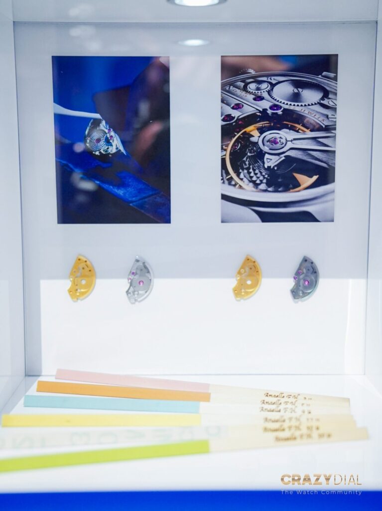 สำหรับโซนจัดแสดงนาฬิกาก็ละลานตามาก เพราะแบรนด์ขนมาให้ชมครบทุกคอลเลกชัน ไฮไลท์เด่นๆ ที่ขโมยซีนสุดๆ คือ G.F.J. รุ่นใหม่ที่มาพร้อมหน้าปัดหน้าปัดหิน “Bloodstone” (หินแจสเปอร์สีเขียวแต้มแร่สีแดง) สุดแรร์ ถัดมาคือตระกูลสปอร์ตยอดฮิตอย่าง Chronomaster Sport ที่รอบนี้มีทั้งหน้าปัดแบบ Skeleton โชว์กลไกสุดเท่ และเวอร์ชัน Two Tones ที่หรูหราขึ้นข้อมือสุดๆ รวมถึง Defy Skyline Tourbillon ที่ยังคงความสปอร์ตหรูและวิศวกรรมความถี่สูงเอาไว้ นอกจากนาฬิกาแล้ว เขายังยกเอากลไกเครื่องรุ่นต่างๆ มาจัดแสดงให้ดูโครงสร้างภายใน รวมถึงการโชว์ชิ้นส่วนนวัตกรรมใหม่อย่าง Zen Clasp (บานพับสายดีไซน์ใหม่) ที่ออกแบบมาเพื่อความกระชับและใช้งานง่ายขึ้นด้วย